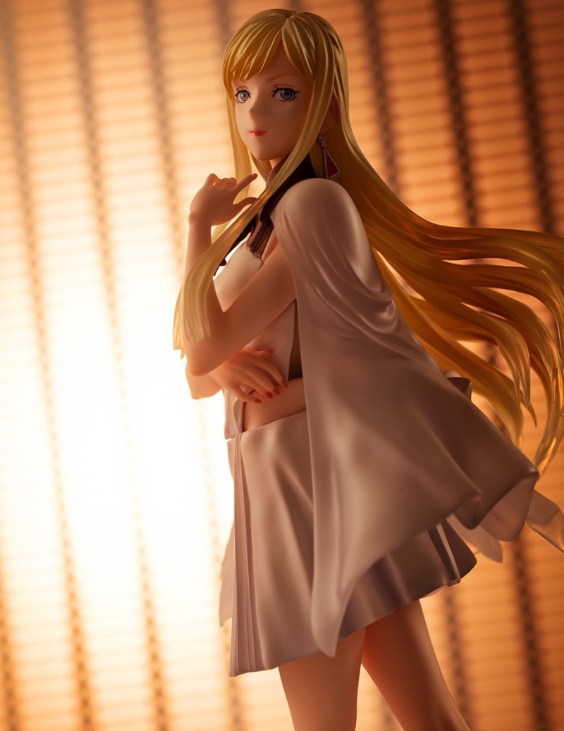 「GGG 琪琪・安達露西亞」1/8比例模型,尺寸全高約 21 公分,將琪琪在劇中出登場時令人印象深刻的白色小禮服造型立體化,在披肩與金色長髮等處採用透明材質打造,飄逸流動的線條,營造出琪琪優雅輕透的透明感。造型講究細節,胸前與背部的黑色薄紗、裙襬延伸出的白皙雙腿及綁帶高跟鞋...在手指也有勾人的刻畫,回眸一笑的魅力表情搭配轉身的迷人姿態,實現了吸引眾人目光、令男性著迷的身影。
