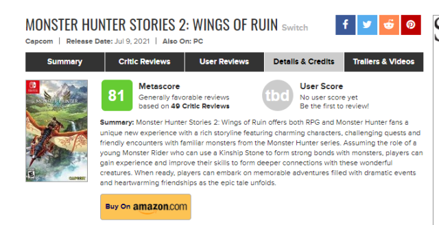 即將在2021年7月9日於全球同步發行的《魔物獵人物語2 ~破滅之翼~》,在日前已經由多達37家電玩媒體給予評分,其中最高分由《App Trigger》打下10分好評,IGN則是給出了8分的成績,最低則是《NME》的6分,而在Metacritic總評分平均81的普遍好評。