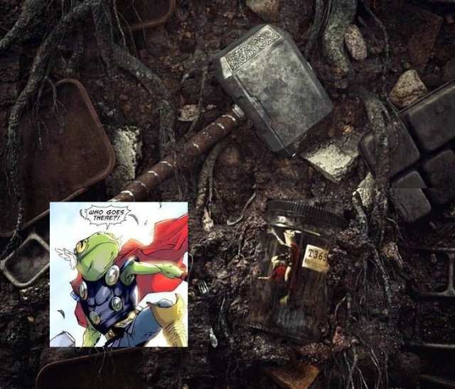 跟著眾洛基來到一個地下堡壘,鏡頭帶到許多掩埋在土裡的事物。其中可以看到一個雷神槌,還有一隻裝在罐中的青蛙索爾。而根據製作人透露,克里斯漢斯沃(Chris Hemswarth)為這場小客串回歸配了一段錄音~