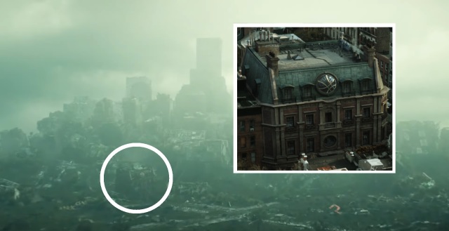 隨著鏡頭推進可以看到許多彩蛋,其中一個一直在預告反覆出現,被認為是戰毀的史塔克大樓。透過另一個角度得知大樓名字是Qeng,在2015年《全新全異復仇者》漫畫中史塔克將公司大樓賣給Qeng Enterprise,背後的CEO正是化名 Mr. Gryphon 的征服者康。