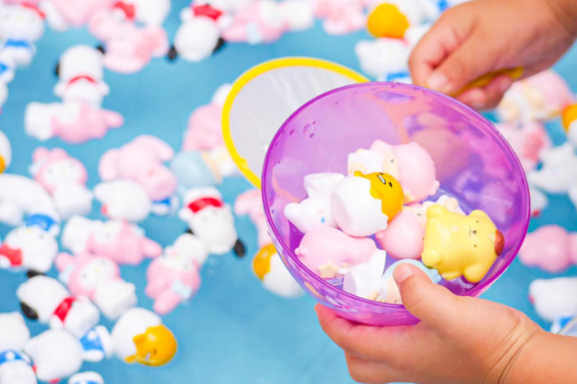 另外,彷彿真的日本祭典般的體驗活動也不容錯過,餐廳中的撈玩偶、使用水槍遊戲、釣水球,以及家長陪同的的Hello Kitty 燒窯繪畫體驗都相當熱鬧,而最高潮處是「乙姫龍宮城的劇院」,在慶典中抽籤區域,餐廳會以燈光投影的方式表現煙火演出!