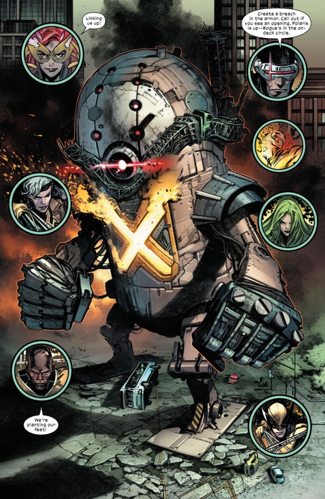 X戰警的每個成員都在創造這台機器人上充分發揮了自己的作用。北極星開始從紐約市的各個建築工地提取鋼筋,並製造出巨大的機械身體。驚奇女孩使用她的心靈感應將團隊聯繫起來。小淘氣的力量和北極星的磁力控制使他們可以輕鬆地操作手臂,同步與金鋼狼則操作腿部;而這台機器人有兩種遠程武器,分別由獨眼龍和陽炎負責。前者能夠通過機甲的頭部發射他的衝擊波,而陽炎則通過北極星在機器中心創造的巨大X符號發射他的火焰。