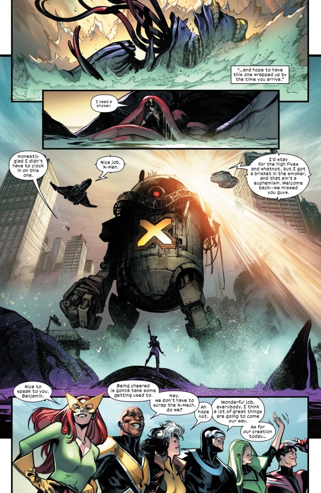 這次X戰警能夠快速創造出巨型機甲實在令人印象深刻,尤其是它濃厚的Power Rangers元素,例如駕駛員分別操縱機器的不同部分、利用他們各自的能力賦予它力量等等。他們在戰後將其作為克拉科位於大西洋的分嶼的燈塔,或甚至可能繼續升級這台機器人,使它變為有用的防禦機制。
