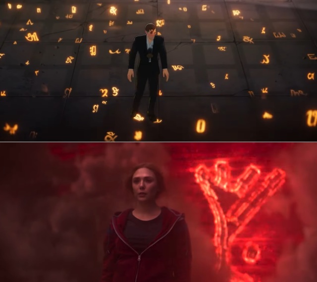 奇異博士看著眼前出現許多符文,接著便掉入了多元宇宙的漩渦。這些符文就與《汪達幻視》結局中汪達變身緋紅女巫時身邊圍繞的符文相似。也可能因此與《奇異博士2》有所連結。