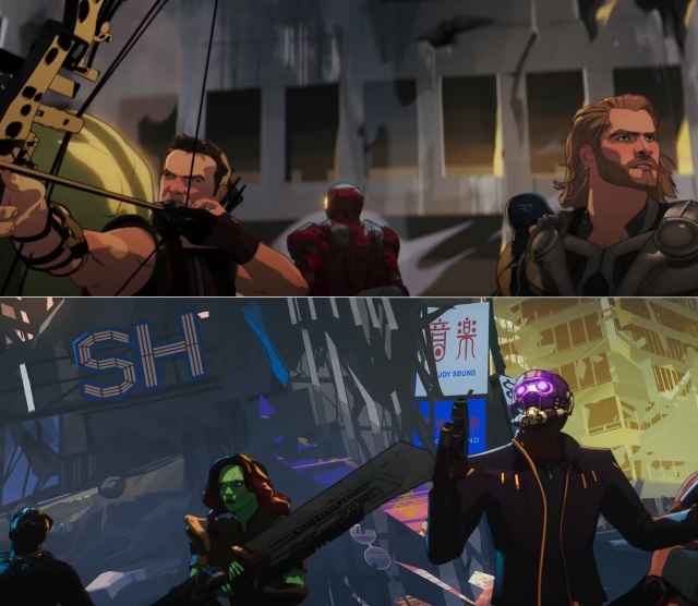 接著是蒂妲史雲頓回歸配音的「古一法師」講述著時間與現實可以千變萬化,畫面也從《復仇者聯盟》經典的180度推軌場景變成一支截然不同的「星際異攻隊」:帝查拉變身「星爵」,葛摩拉身穿薩諾斯的戰甲,還有另一個版本的「黑豹」與索爾等人。