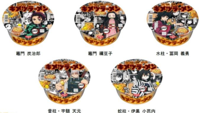 13種角色共分為三大類商品,「鬼滅一丁」(「出前一丁」的意思為速遞一份,1968年於日本日清推出 )、「元祖雞蓋飯」、「元祖雞油蕎麥麵」,其中「元祖雞蓋飯」包含竈門炭治郎、竈門禰豆子、水柱.富岡義勇、音柱.宇髓天元、蛇柱.伊黑小巴內。