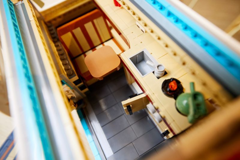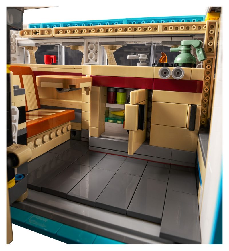 這次的 T2 一共有 2207 片零件,多了先前的樂高 T1 快要 900 件,組裝完成之後長約 35 公分,高度則是 15 公分左右,再現了白、藍色主調的車身與整體的圓潤造型,跟 T1 類似的保桿、擋風玻璃、裝上備胎但依舊能一眼認出的標誌性車頭也有不錯的還原度,除了車門可以像實車一樣滑開之外,本作還搭載了前輪轉向、後車廂與引擎蓋可掀開,以及彈出式車頂,更讚的是就連車子的內裝、冰箱、小桌子、水槽......等細節也都十分精美,展現出 T2 充分利用車內空間的設計。