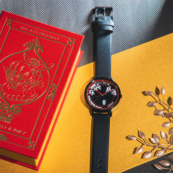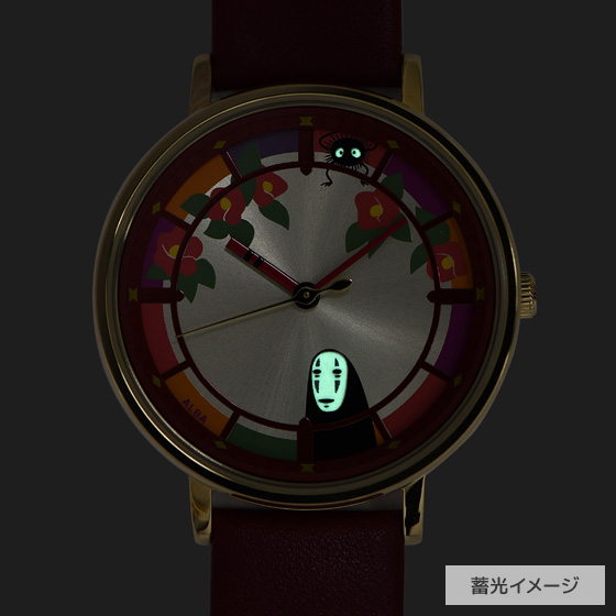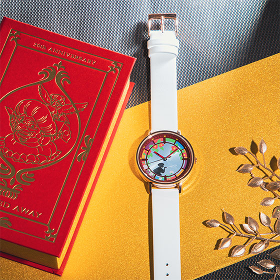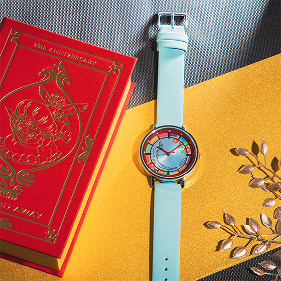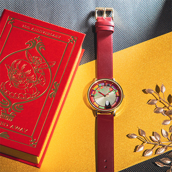 以漆黑的背景配上通往澡堂「油屋」 的紅色橋墩的欄杆,以及行走中的無臉男與御白樣(ススワタリ) ,圖案還有著蓄光功能,黑暗中可以發出光芒。錶身背面還有著 20 周年的紀念圖騰,連錶帶後方都有巧思設計藏著。