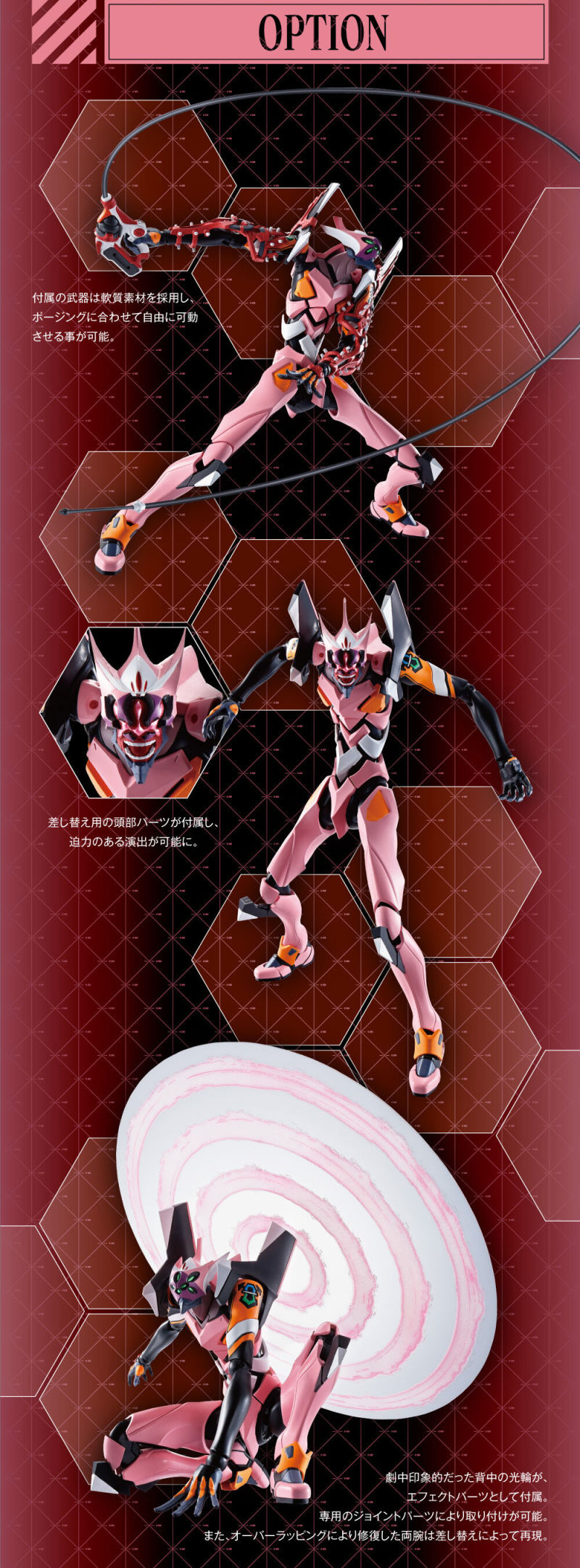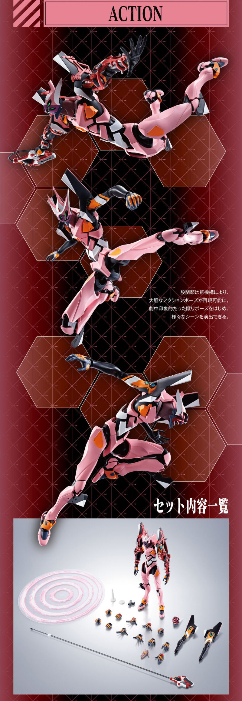 商品內容:本體、替換用手掌左右各3種、替換用腕部左右、替換用腕部用手掌左右各2種、替換用頭部、武器、新2號機α用交換手掌右、光輪特效、特效連接零件、魂STAGE用連接零件