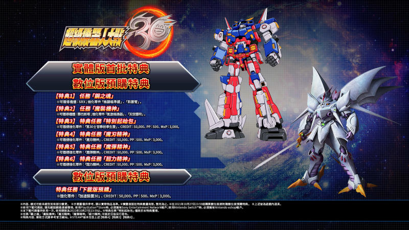 台灣萬代南夢宮娛樂宣布,Nintendo Switch™/PlayStation®4/STEAM®《超級機器人大戰30》將在2021年10月28日正式推出!同步公開製作人問候影片,揭露遊戲參戰作品、遊戲系統及特典情報。