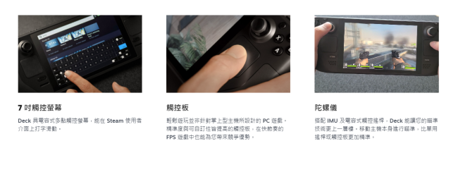 根據Valve表示,此款為Steam PC遊戲專屬設計的「STEAM DECK」掌機,搭載了與AMD共同研發的AMD Zen 2 APU,以及7吋1280×800 60Hz LCD觸控螢幕,內建4核8執行緒Zen 2 CPU,與8 RNDA2 CU整合處理器,最高至 1.6 TFlops FP32,能夠玩Steam平台上的3A大作。
