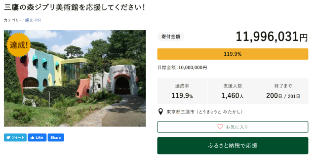 為了拯救財政危機,三鷹市當地政府開始進行「故鄉納稅」的募資,希望可以透過募資的方式讓美術館能夠度過難關。立刻引起了網友的響應,也讓募資目標一千萬日幣在短短一天就達標。