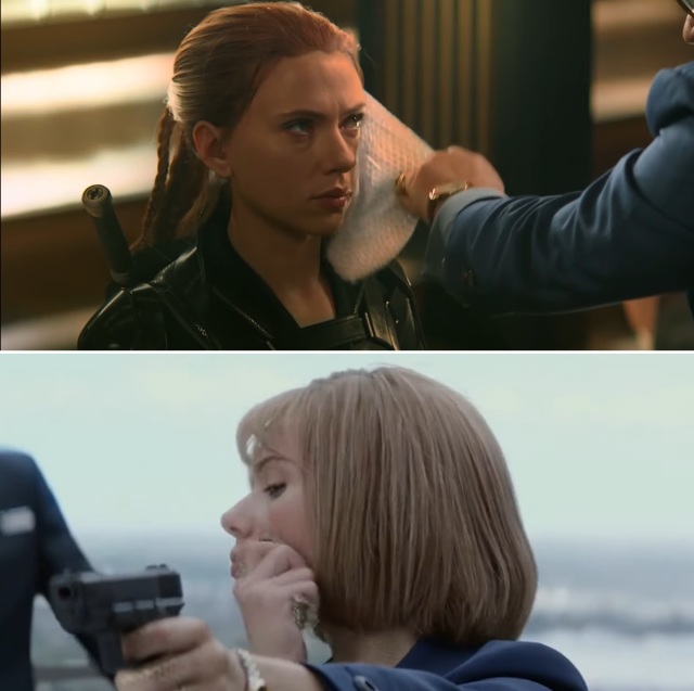 娜塔莎在挪威買了一堆東西,其中一個就是金色的染髮劑。對應了之後她會以一頭金髮迎戰薩諾斯。而這個髮型其實也是致敬漫畫中葉琳娜的造型。