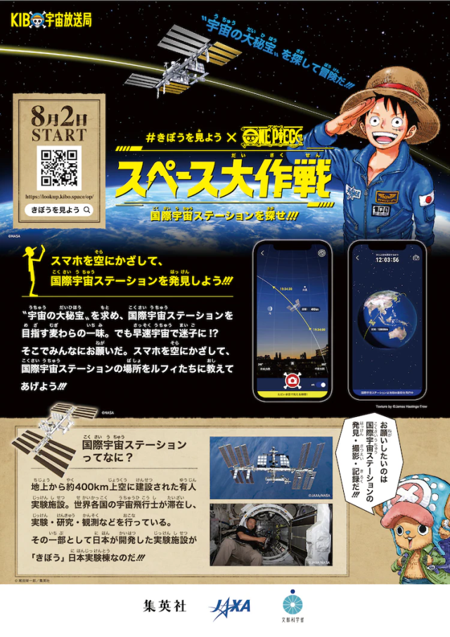 在 8 月 2 日將可以於官方合作特設網站上看到 ISS(國際太空站)的航線可視預報服務「#きぼうを見よう」連動的合作內容「#きぼうを見よう×『ONE PIECE』スペース大作戦」。而更多詳細將會在 8 月 2 日發售的《週刊少年Jump》第 35 期上公開發表。