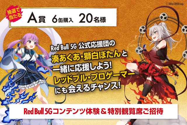 繼上ㄧ次的紫色Red Bull合作後,Hololive「湊阿庫婭」「獅白牡丹」再ㄧ次擔任Red Bull 5G官方應援團虛擬代言人,這是自2016年來第6回的「Red Bull 5G」活動,將舉辦與電競選手見面、入手限定遊戲道具與抽選獎品的大型狂歡活動。