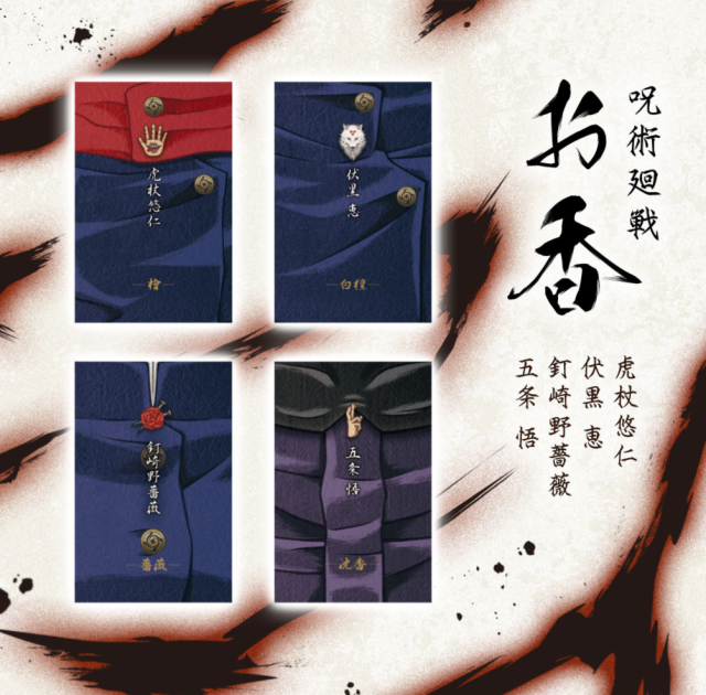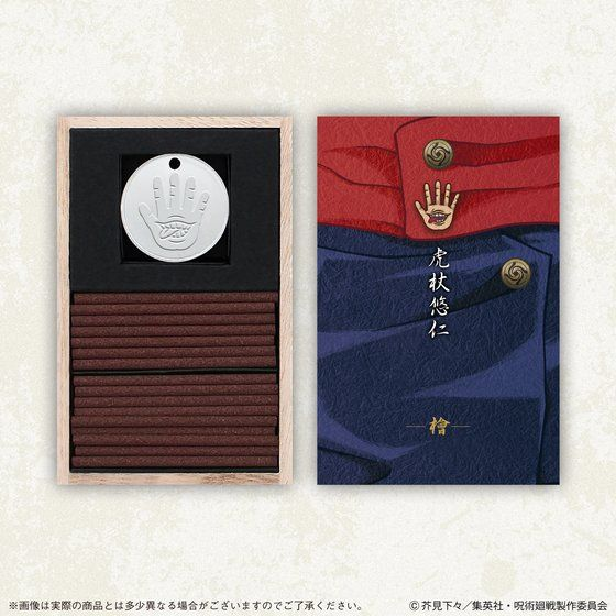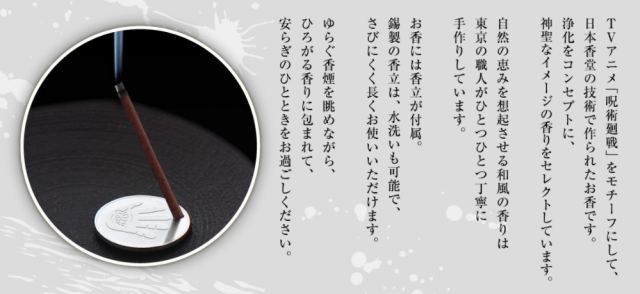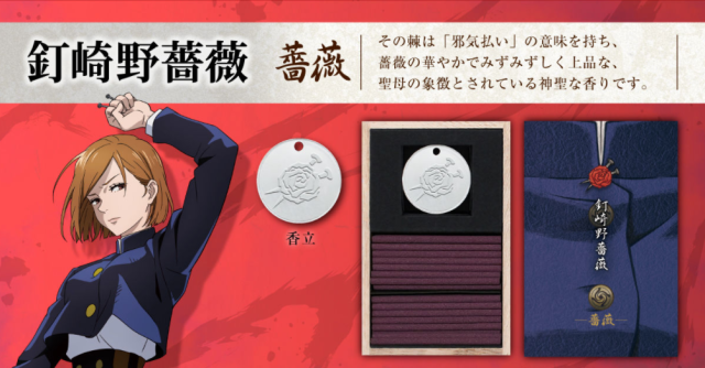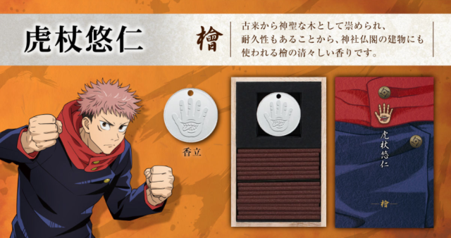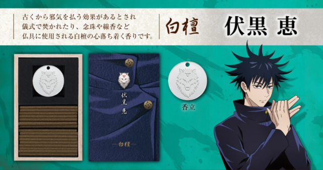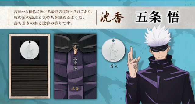 這次與《咒術迴戰》合作,推出,包含;虎杖悠仁、伏黑惠、釘崎野薔薇與五條悟,分別代表不同香氣的薰香。虎杖悠仁款使用「檜木」的香氣;伏黑惠款則是使用「白檀」的氣味;釘崎野薔薇款使用名字中的「薔薇」氣息;五條悟款使用佛壇前使用的最高級「沉香」代表其作為咒術迴戰最高戰力的象徵。