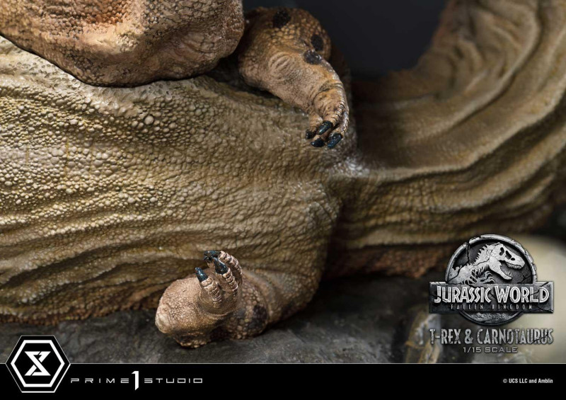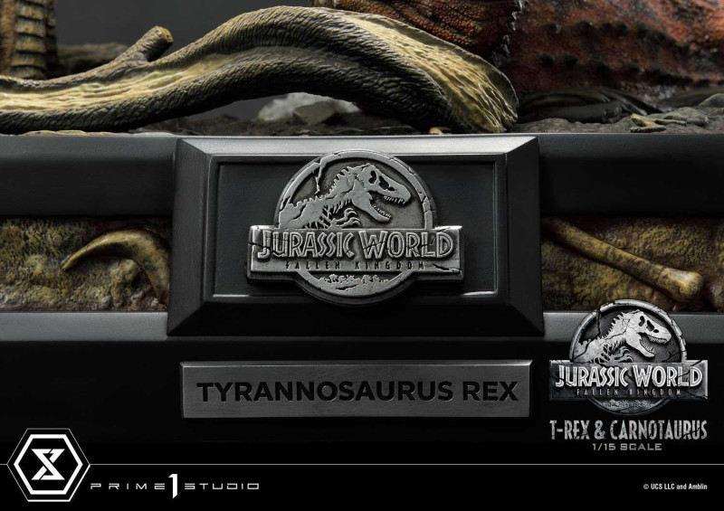 本作是依照《侏羅紀世界:殞落國度》中牛龍準備襲擊歐文一行人、結果反被霸王龍一口咬住脖子,霸王龍接著怒吼的魄力場景設計,高約 49 公分,長度則來到驚人的 90 公分,再現了霸王龍立於食物鏈頂端的王者姿態,被踩在腳下的牛龍也深刻地傳達出無力反抗的樣貌,一旁還站著歐文,加上散落在周圍的石塊、斷裂的巨木與樹枝,充分表現出電影中努布拉島上的環境。