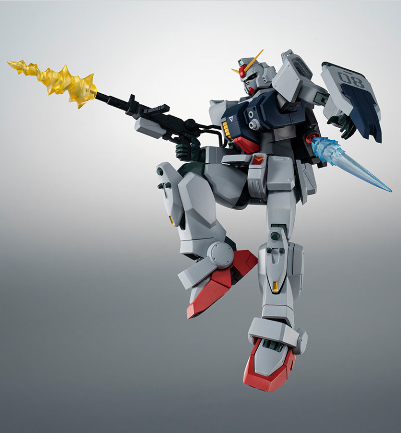 100mm機槍、180mm加農砲兩種武裝都能拆解並收進武器櫃,此外還有收納於小腿外側的光束軍刀、左手裝備的小型盾牌與射擊特效等豐富配件。若想進一步擴充可玩性,ROBOT魂也同步發表「第08小隊擴充配件組 ver. A.N.I.M.E.」包含導彈發射器、火箭發射器、多種特效零件,可再現劇中經典場景!
