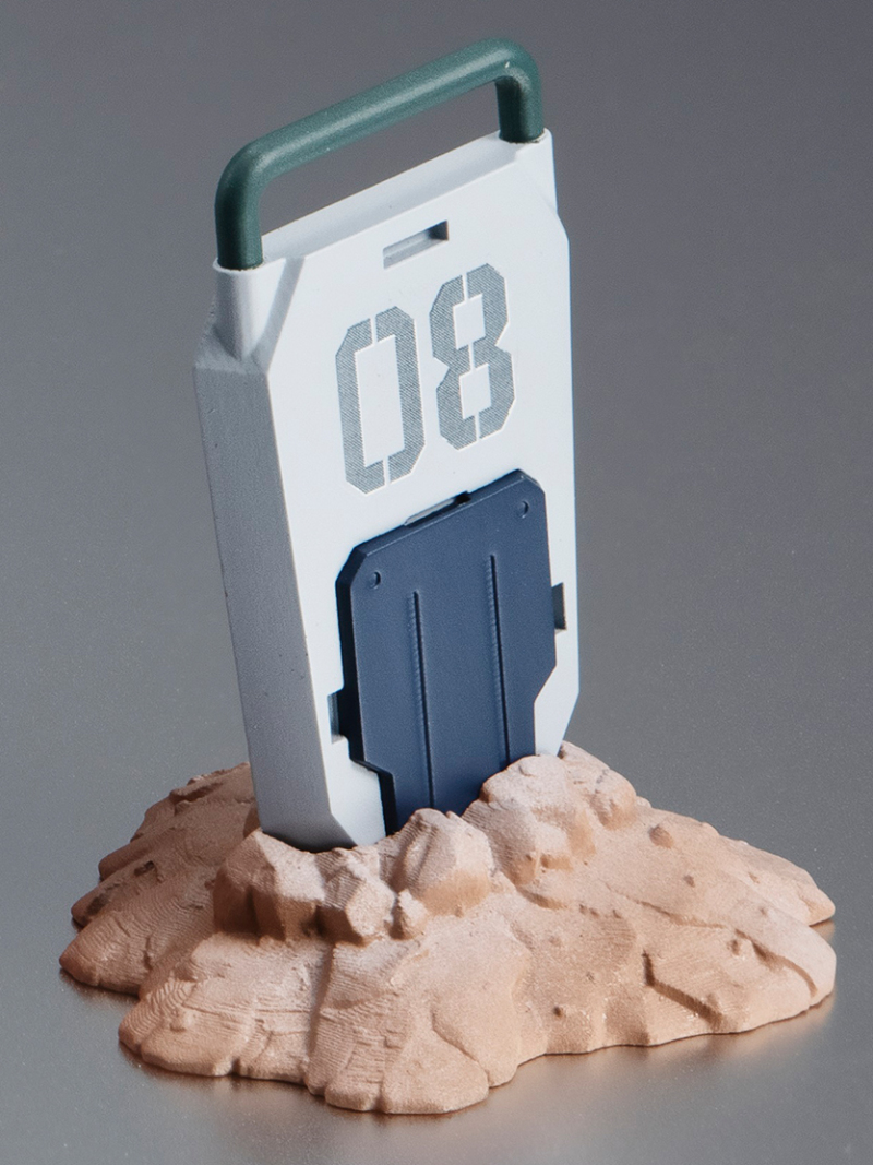 ・還附上再現小型盾牌插進土裡的專用台座、180mm加農砲射擊特效、因反作用力揚起的沙塵等多種特效,能夠搭配陸戰型鋼彈再現 OP 動畫中經典的「閃耀射擊」場景!