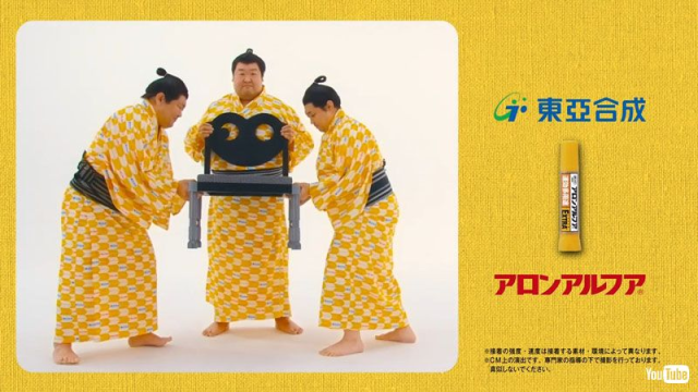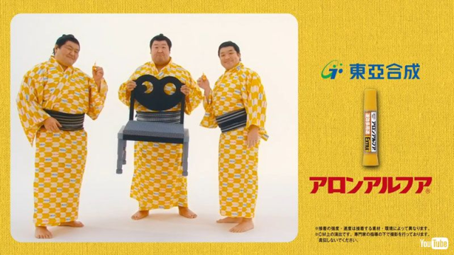 本次廣告是邀請了三位相撲力士來宣傳這款三秒膠,只要擠出豆子般大小的膠就能將椅子的腳緊密黏合,而且是三秒快乾,非常快速,不過這廣告有15秒,介紹完產品要幹嘛?剩下時間來玩「大風吹」好了。而且即使是體重破百的力士坐在這已經用三秒膠組合好的椅子上也不會因為重量而垮掉,再次顯示了該產品的強力黏性。