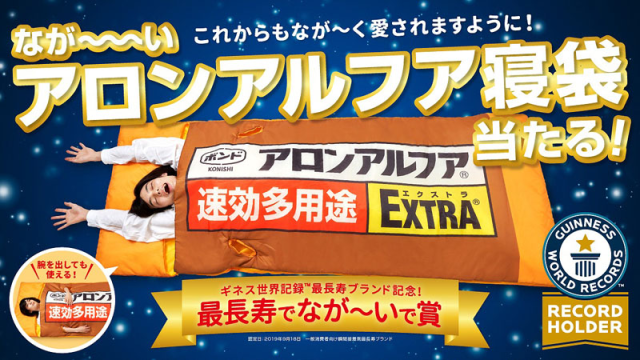 另外,為了慶祝アロンアルフア發售50週年,在製造商「東亞合成」的特設網站上還有抽獎活動,第一彈為造型抱枕「アロンアルフア最後的ア是大ア」(アロンアルフアの最後の“ア”は“大きいア”です),只要在今日(7/21)開始到8月20日為止跟隨アロンアルフア的官方推特並轉推活動推文就有機會抽中這個大ア抱枕,而8月21日開始為第二彈「アロンアルフア三秒膠造型睡袋」。