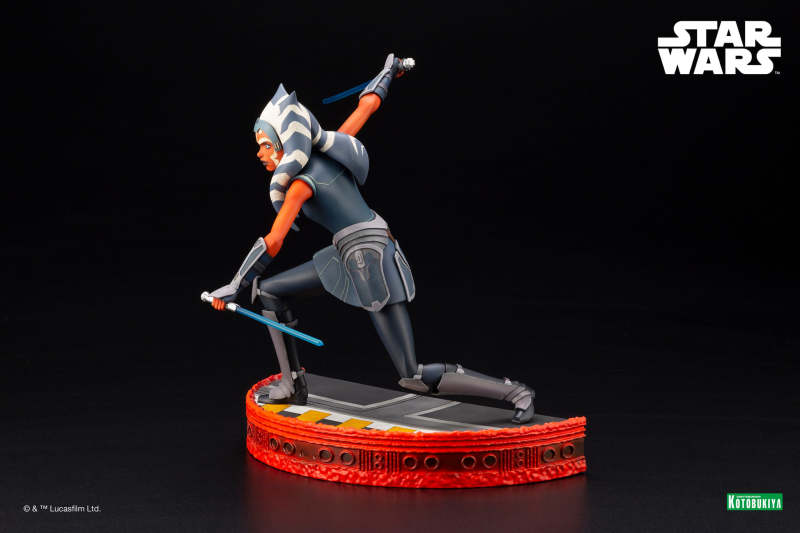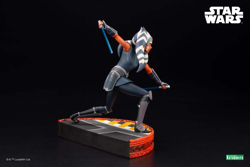 本作高約 24 公分,根據《複製人之戰》最終季的造型設定,再現了亞蘇卡手持兩把藍色光劍、重心壓低的戰鬥姿態,除了身為托古塔族(Togruta)特有的面部圖騰、條紋頭角,與偏橘的膚色之外,深藍拼灰色的戰衣、護甲也刻畫出各處細節,頭雕部分更逼真地傳達出亞蘇卡面對強敵時的表情神韻,而根據壽屋官網表示,半圓形底座可以跟之後將會推出的雷克斯(キャプテン・レックス)搭配,展現出兩人共同戰鬥的場面喔。