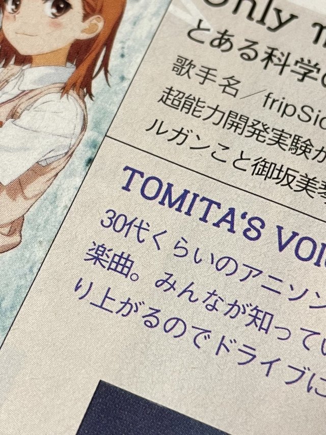 《超電磁砲》的主題曲「only my railgun」......被評為「大約30幾歲世代的動畫歌愛好者心中的珠玉之作,幾乎家喻戶曉、又能炒熱卡拉OK的氣氛,開車的時候也非常適合聽。」