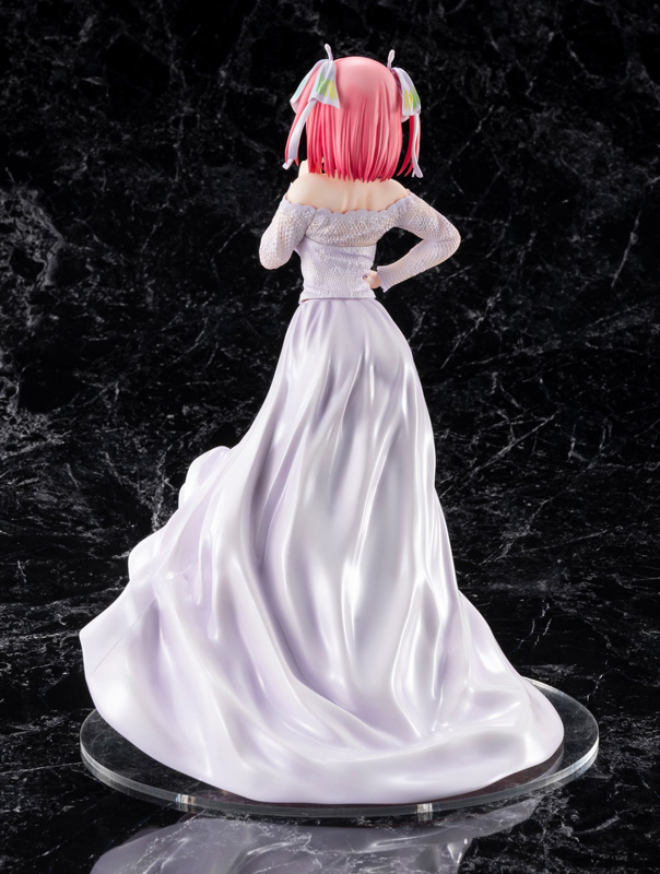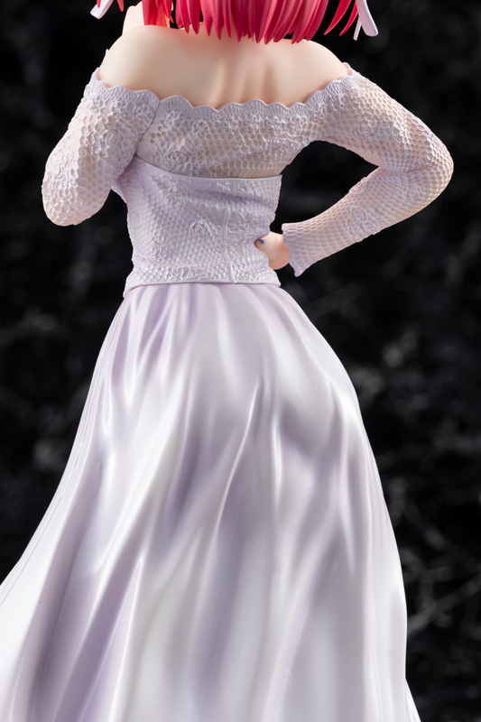 「中野二乃 婚紗ver.」1/7 比例 PVC塗裝完成品,整體尺寸約高 250 mm,以漫畫單行本第 8 封面插圖為基礎製作,將二乃身穿白紗的造型立體化,在表情部分把原本調皮的吐舌更改為一抹略代高傲的淺淺笑容~造型細膩刻畫純白婚紗複雜的躍動皺摺和蕾絲紋,珍珠白塗裝賦予豪華光澤感;合身的設計表現出二乃姣好的身材曲線,飄逸的裙襬更是露出美腿線條,搭配短髮的造型,相當亮眼!在指甲等處的細節也展現二乃的性格。