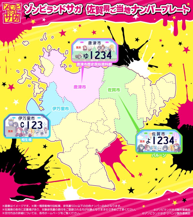 以日本佐賀縣為背景,由 MAPPA、avex pictures、Cygames合作推出的原創動畫《佐賀偶像是傳奇》(ゾンビランドサガ) ,以「新感覺喪屍系動畫」為特色,至今已播出動畫兩季。最近官方與佐賀縣當地合作,推出了佐賀縣專屬機車車牌,以 Q 版人物圖像結合,將推出佐賀縣全 20 市町的樣式,目前推出第一彈-佐賀市、唐津市與伊萬里市,限量發行。