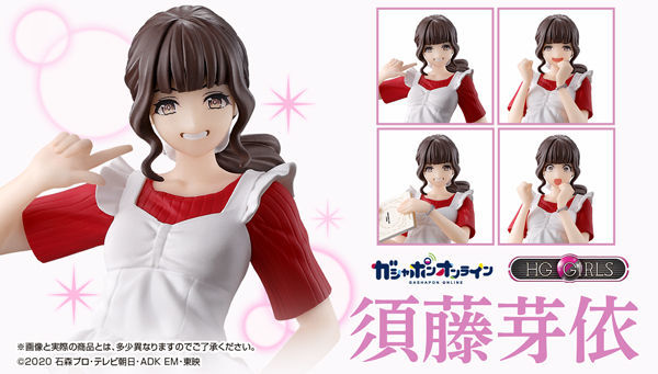 「HG GIRLS 須藤芽依」與 HG GIRLS 伊絲同樣由繪師深井涼介設計製作,將芽依以動漫插畫風格立體化為美少女模型。尺寸全高約 135 mm,還原芽依的服裝造型~並設計有四款不同的臉部表情和搭配表情的不同手臂零件,呈現A、B、C、D四種樣式,除了驚訝握拳的表情D 中獎機率為稀有的 10% 之外,其餘三款表情抽種機率皆為 30%,喜歡芽依的玩具人可以試試手氣~