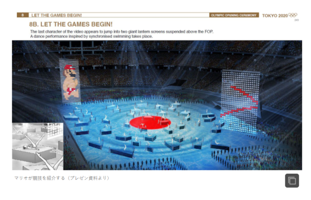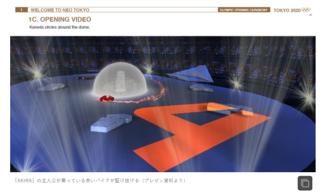 在企劃書的概念圖中可以看到,電玩大廠任天堂旗下招牌明星「瑪利歐」,本會是登場在開幕會的兩面投影螢幕中,與有如《超級變變變》的「真人動態符號」一同演出,這正好與2016年里約奧運閉幕會的表演有所呼應;以及被網友稱為是「預言家」的經典動畫《阿基拉》中的金田摩托車,本來也能夠在奧運會上行駛。