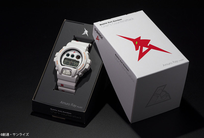 「G-SHOCK 阿姆羅·雷」錶款,將阿姆羅在《機動戰士鋼彈 逆襲的夏亞》中所屬隆德・貝爾隊的駕駛服造型為原型設計, 在手錶上融入了駕駛服特徵的白紅色搭配,錶帶白底紅線條呈現俐落風格;除了錶上印有阿姆羅的個人標誌,在開啟EL冷光照明後,錶面也會浮出「紅色獨角獸」,展現傳奇鋼彈駕駛員的氣勢。另外,在金屬錶背則刻有隆德・貝爾的部隊LOGO,令人聯想到《機動戰士高達夏亞的逆襲》的世界觀。