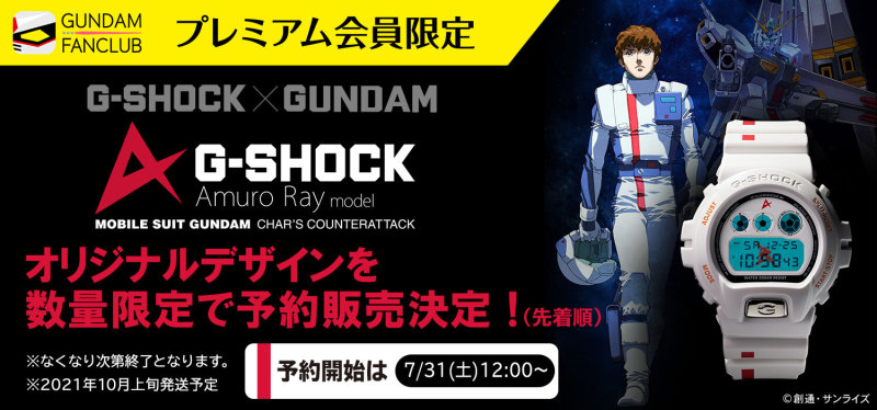 日本 BANDAI NAMCO 與電子產品製造公司卡西歐(CASIO)旗下的知名腕錶品牌 G-SHOCK 合作,推出在官方 App「GUNDAM FAN CLUB」限定販售的《機動戰士鋼彈 逆襲的夏亞》記念手錶「G-SHOCK 阿姆羅·雷」錶款,參考售價為 22,000 日圓,預計於 2021 年 7 月 31 日開放預購(僅 Premium 會員具購買資格)、10 月上旬發貨。