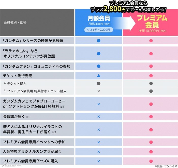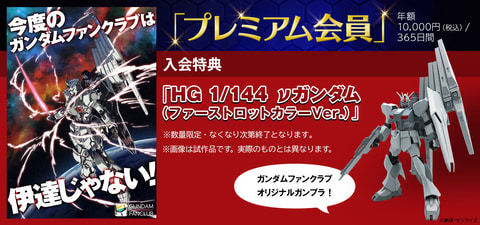 「GUNDAM FAN CLUB(ガンダムファンクラブ)」是一款鋼彈系列粉絲向app,一般會員需支付月費(每月600日圓)即可盡情觀看鋼彈系列TV、OVA、劇場動畫,同時也提供粉絲投稿、周邊販售、電子書籍等功能。高級會員則是年費 10,000 日圓,並享有特別包裝的組裝模型等更多會員優惠。
