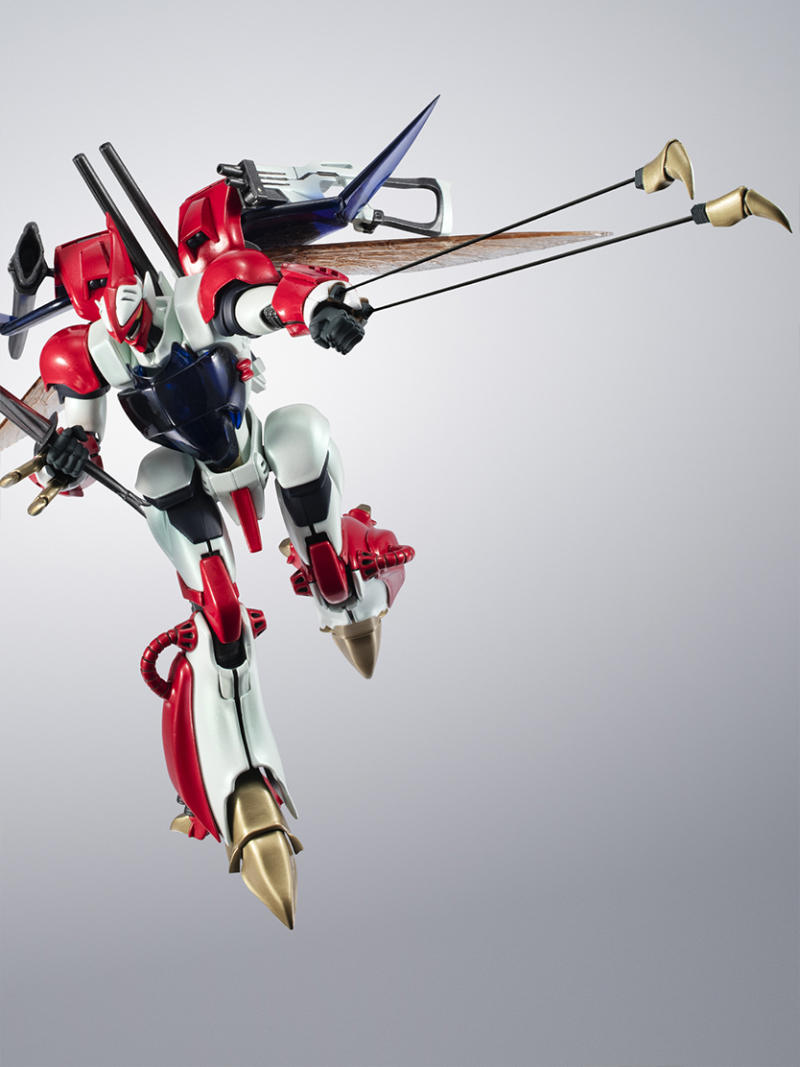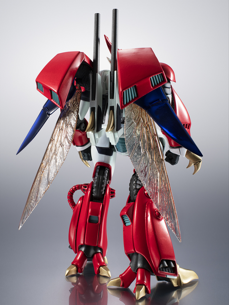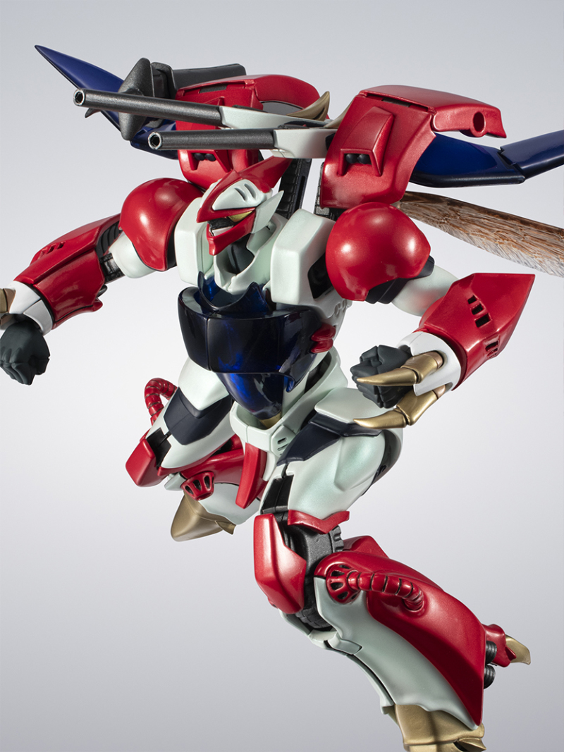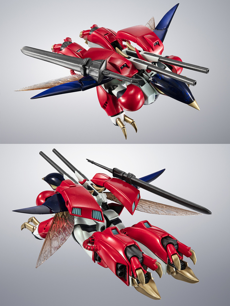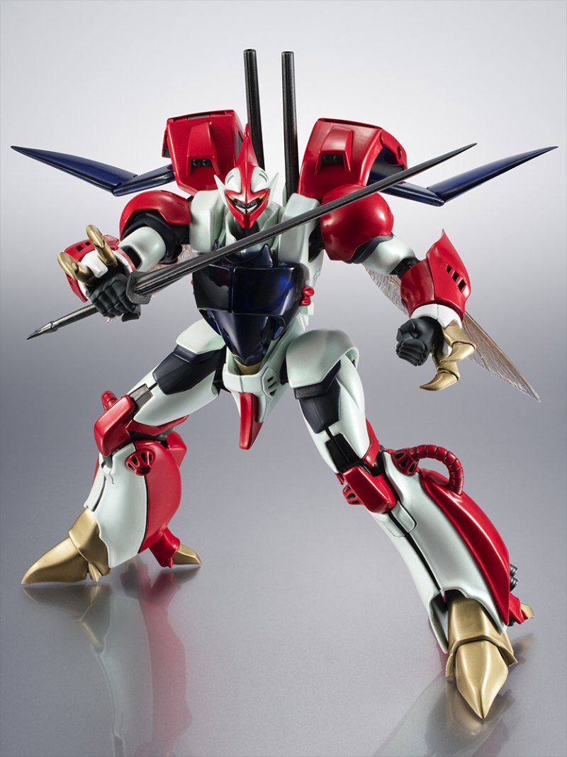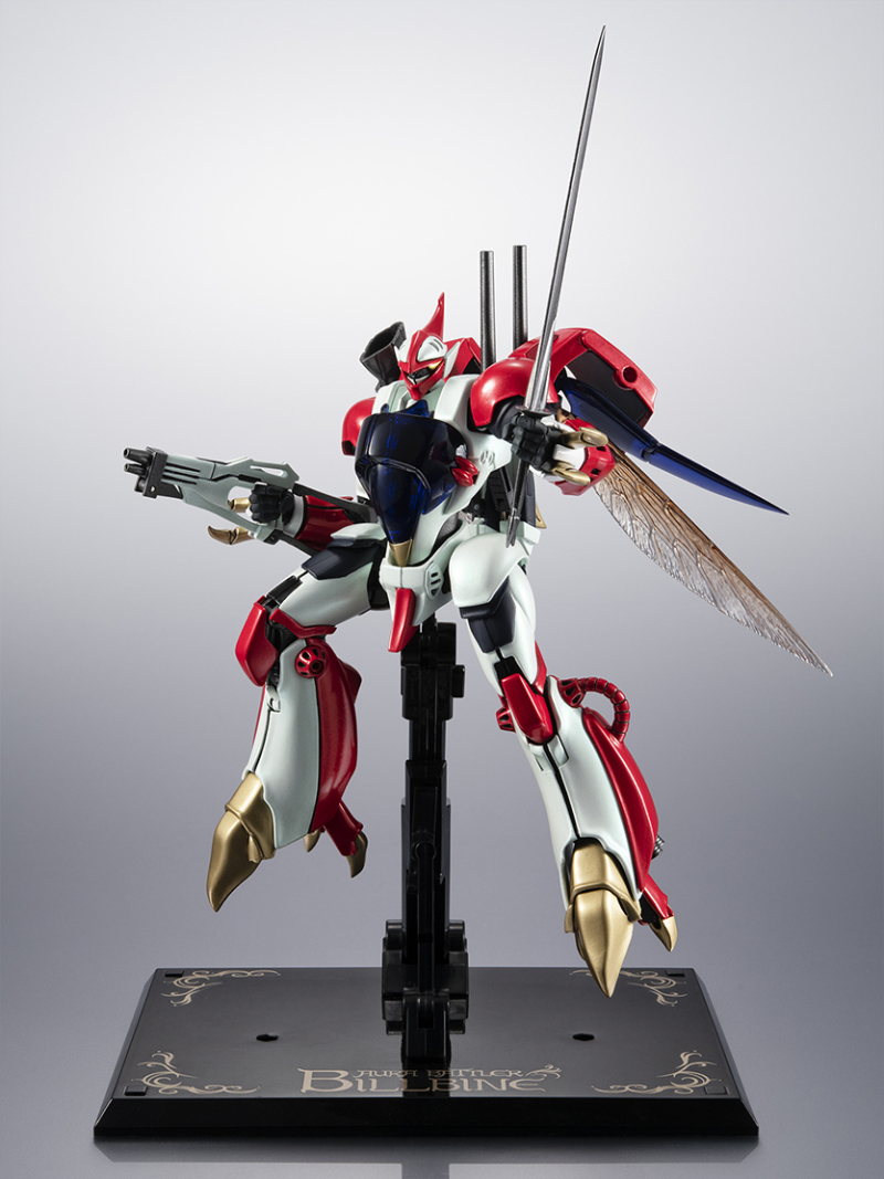 「METAL ROBOT魂 比爾拜因」基於最新設計稿以完全新規造型製作而成,幾乎所有外裝甲都經過塗裝,並在胸部內構、兩側手甲、膝蓋以下等部位使用合金材質,背部昆蟲般的雙翼則以透明材質成形,不僅擁有帥氣造型、強固的關節,把玩時也能感受沉重手感。