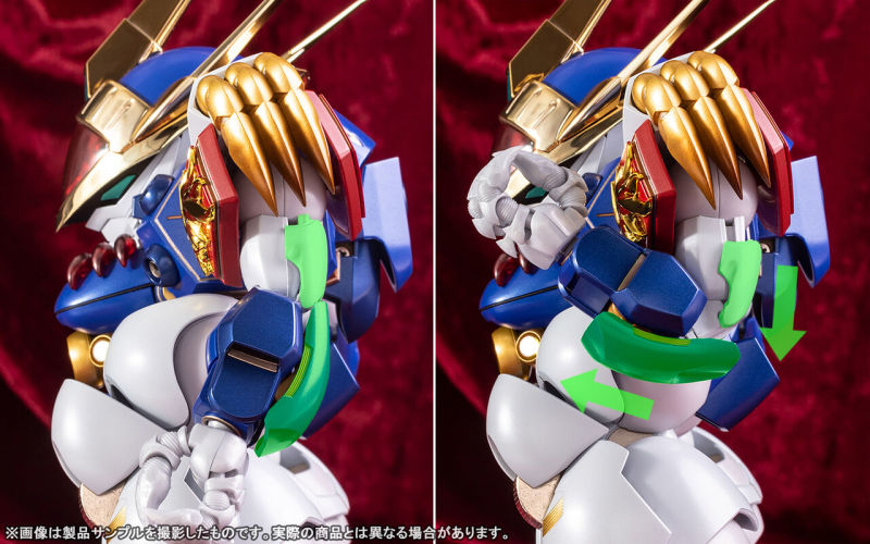 而另一樣特色「如龍鱗般可動的外裝甲」可以解讀成一般常說的裝甲連動機構。開發團隊表示,這次的裝甲設計是最具挑戰的部份,過去推出的龍神丸商品幾乎都依照原作中洗練的整片裝甲設計,必須在不影響外觀的情況下分割裝甲,還要反覆測試零件間距,確保不會造成表面刮漆。整體可動性可能比各位想像的還要高,請搭配說明書進行把玩。