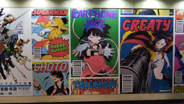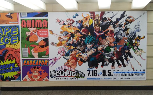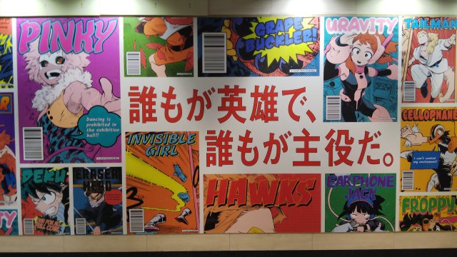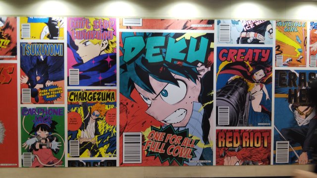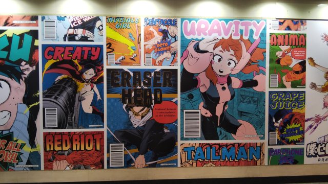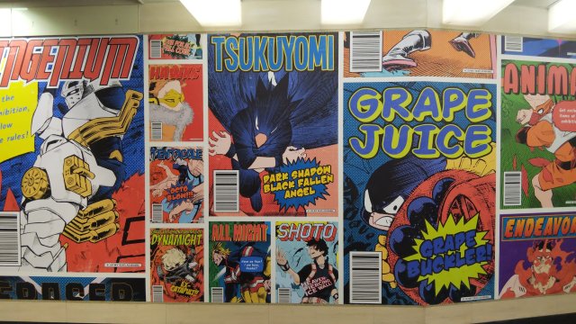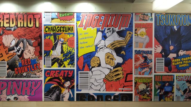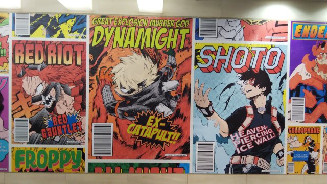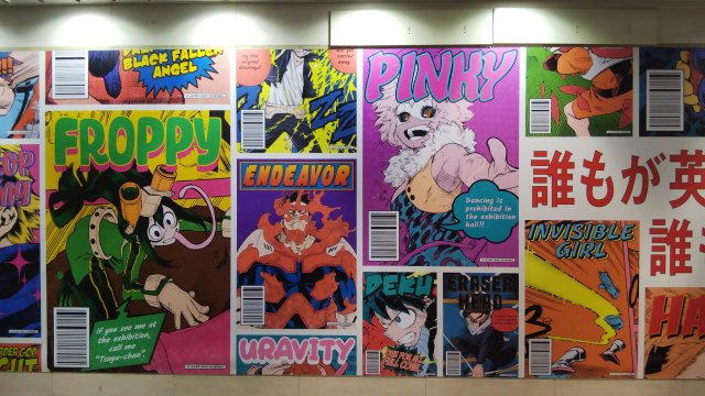 而除此之外,近日在大阪阪急電鐵的大型廣告看板中,可以看到作者堀越耕平為《我的英雄學院》旗下角色繪製了以「美漫角色個刊」為特色的主題,並以80年代美漫封面風格,來為每位人物設計的不同封面,可以看到一幅幅精緻圖畫陳列在這幅廣告看板中,不僅感到壯觀,且表達出強烈的十分獨特性。