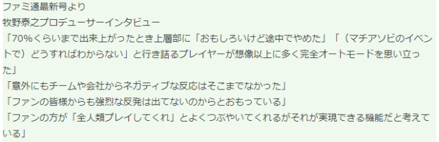 根據採訪,FAMI通過製作人牧野泰之訪談理解到遊戲測試時,有70%開發者會因為引導機制與難度放棄,考慮玩家卡在故事上的挫敗,決定加入「全自動故事模式」來自動通關—作為一個解謎遊戲意外的在開發者間沒有受到消極性排斥。