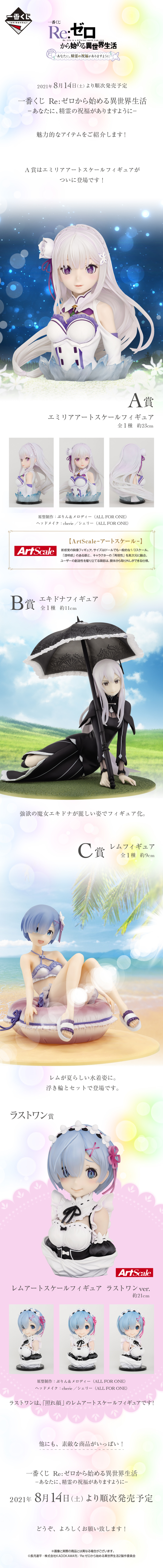 「一番賞《Re:從零開始的異世界生活》ー願你得到精靈的祝福ー」以劇中人氣女性角色為主題,推出 A 賞「ArtScale 愛蜜莉雅胸像」、B賞「艾姬多娜角色模型」、C 賞「雷姆角色模型」。其中最引人注目的 ArtScale 愛蜜莉雅胸像,以 1/3 比例的 23 公分尺寸呈現,透過透明感的水亮雙眼與立體雙唇等設計,讓愛蜜莉雅魅力笑容更加具有真實感!