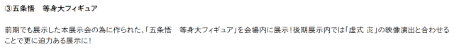 前期會場展出的等身大五條悟雕像,後期將會配合發動「虚式 茈」 的動畫展現出更不一樣的風貌,喜歡五條悟老師的粉絲千萬不能錯過 XD。