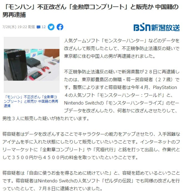 7月8日,中國某蔣姓27歲男子因提供《薩爾達傳說:曠野之息》存檔修改盜版服務而被日本新瀉縣警方鎖定,最後以「不正當競爭防止法」逮捕。而在過了20天後,該男子又以提供《魔物獵人》存檔服務重蹈覆轍。