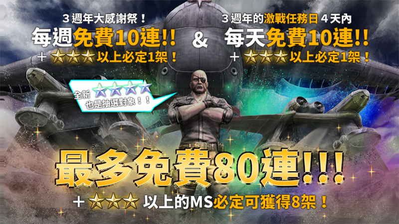 舉辦保證獲得★★★以上機體1架的免費抽選配給(最多80連抽) !