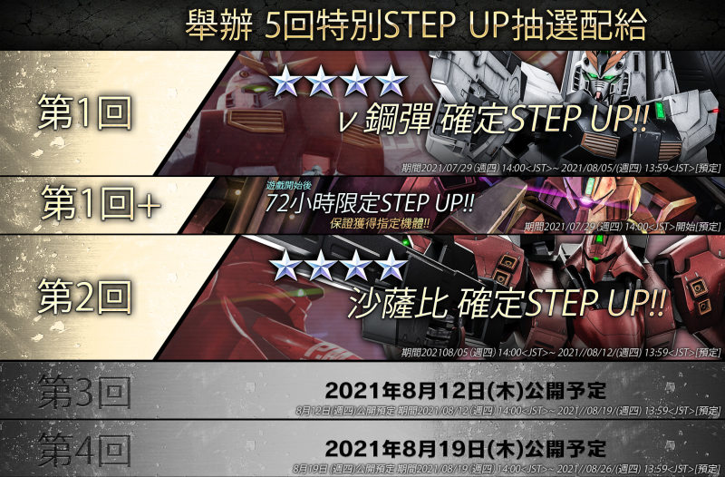 遊戲將連續4週舉辦保證可獲得「ν鋼彈」「沙薩比」、可獲得未獲得機體等的STEP UP抽選配給。第2波起的詳情將會陸續向各位公布。