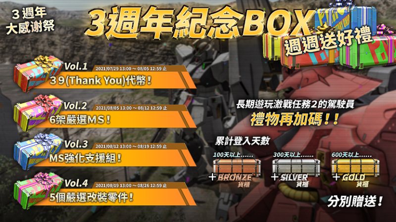 遊戲將連續4週贈送包含代表感謝心意的39枚代幣、機體、強化道具組、改裝零件等的紀念箱。此外,禮物內容量會隨著各位駕駛員參戰《激戰任務2》至今的累計登入日數而增加。