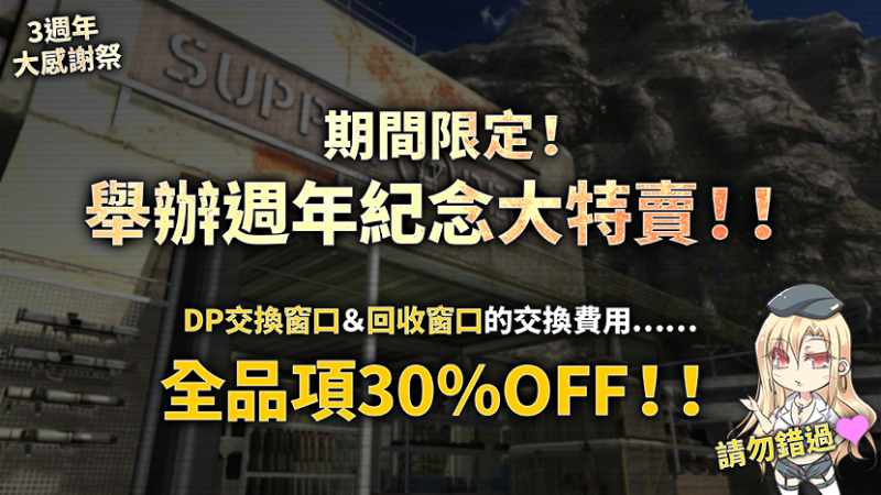3週年慶大感謝祭期間將舉辦週年慶特賣,所有可在物資配給局的DP交換窗口、回收窗口交換的物資一律下殺30%。