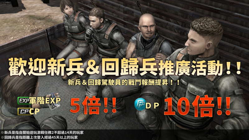 針對《激戰任務2》參戰日算起14天內的新兵&45日以上未曾登入《激戰任務2》的回歸兵,將舉辦戰鬥報酬EXP和CP提升為5倍、DP更將提升為10倍的特惠活動。