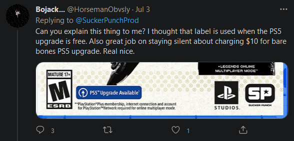 另外一位玩家以「支持PS5標籤」作為切入點,他表示這個圖案分明是在「免費PS5升級」才會使用,對於另加費用抱持極大不滿。
