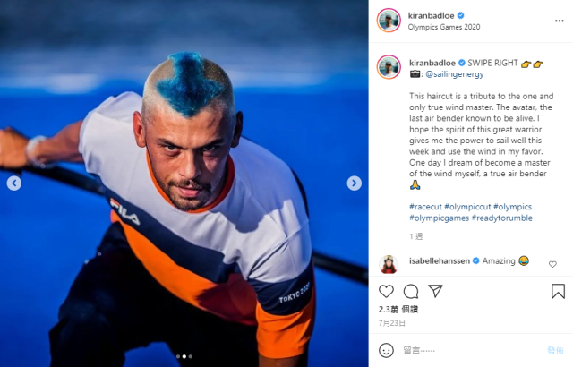 根據外媒《Latest News India》報導,荷蘭帆船選手基蘭·巴多(Kiran Badloe),為了模仿著名歐美動畫《降世神通:最後的氣宗》主角「安昂」的造型,不但將頭髮理成箭頭的造型,還特別將頭髮染成了藍色。更有趣的是,該名選手手持划槳的動作,更像是主角安昂握著滑翔杖的姿態,再加上基蘭·巴多的髮型,彷彿真的就像是神通王登場奧運賽會一樣。