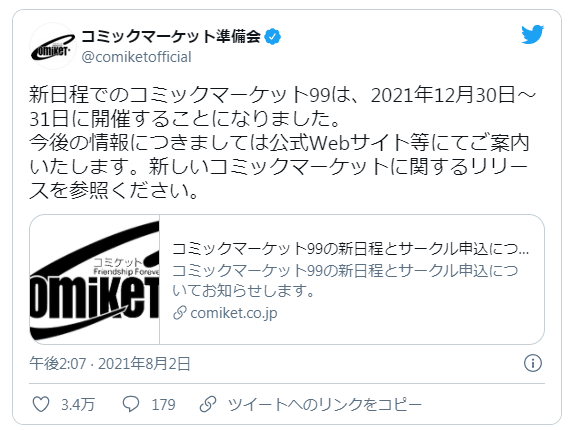 今日(2)官方宣布作為日本最大的ACG嘉年華-Comic Market(簡稱Comiket)第99屆舉辦日期在即,從去年7月宣布終止至今不段累積延長,根據官方表示,在今年12月30日-31日將預計回歸,儘管疫情形勢尚不開朗,但計算疫苗進度與日本疫情掌握狀況,最終得出的參照日期。
