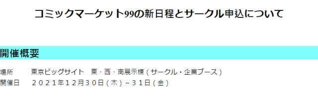 本次COMIKET將以冬季C99形勢舉辦,是基於1975年開始的大型活動,通常一年舉辦兩次,而本次將是46年來第99次的ACG傳承活動,相信將會以報復性消費的力量重回ACG最具代表性的活動。